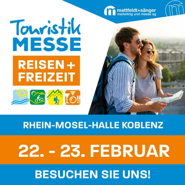 Wir sind am 22. und 23. Februar 2025 Aussteller bei der Touristik Messe Reisen + Freizeit in der Rhein-Mosel-Halle Koblenz.