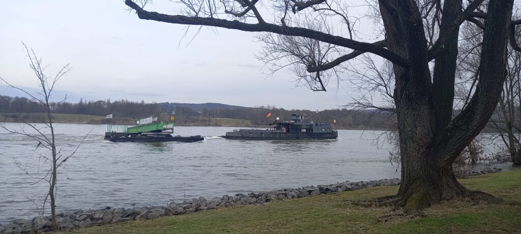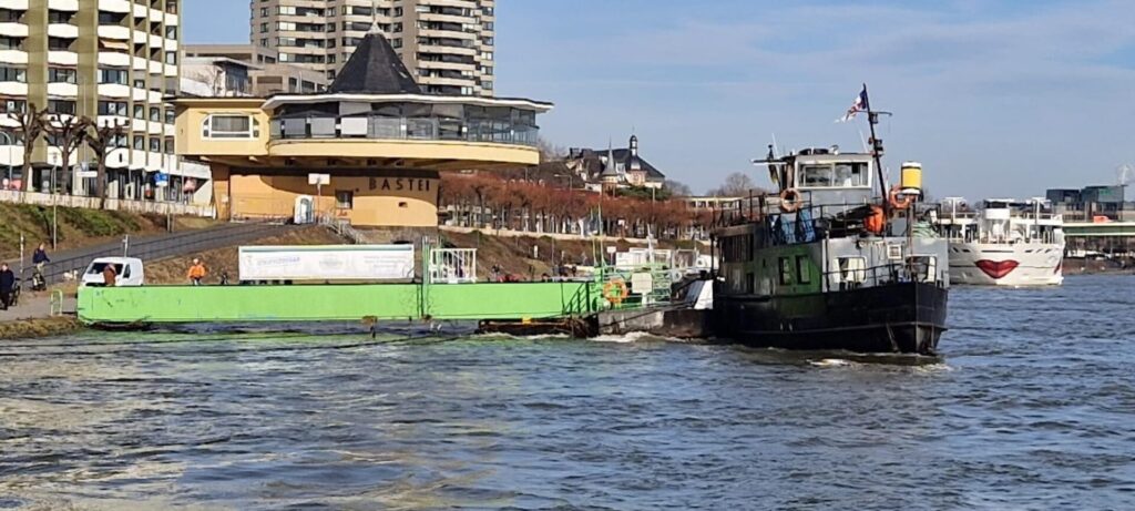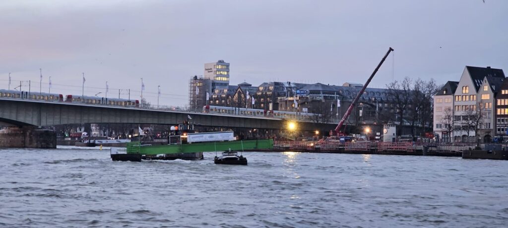 Und so konnte man einmal beobachten, wie es aussieht, wenn eine Anlegebrücke auf Reisen geht. Ein Dank für die Fotos geht an Christian und Fabian Nahrendorf, die den Abtransport in Köln dokumentiert haben, sowie an unseren Schiffsführer Hans Adam, der den Weg des Anlegers auf seinem Fahrrad verfolgt hat.