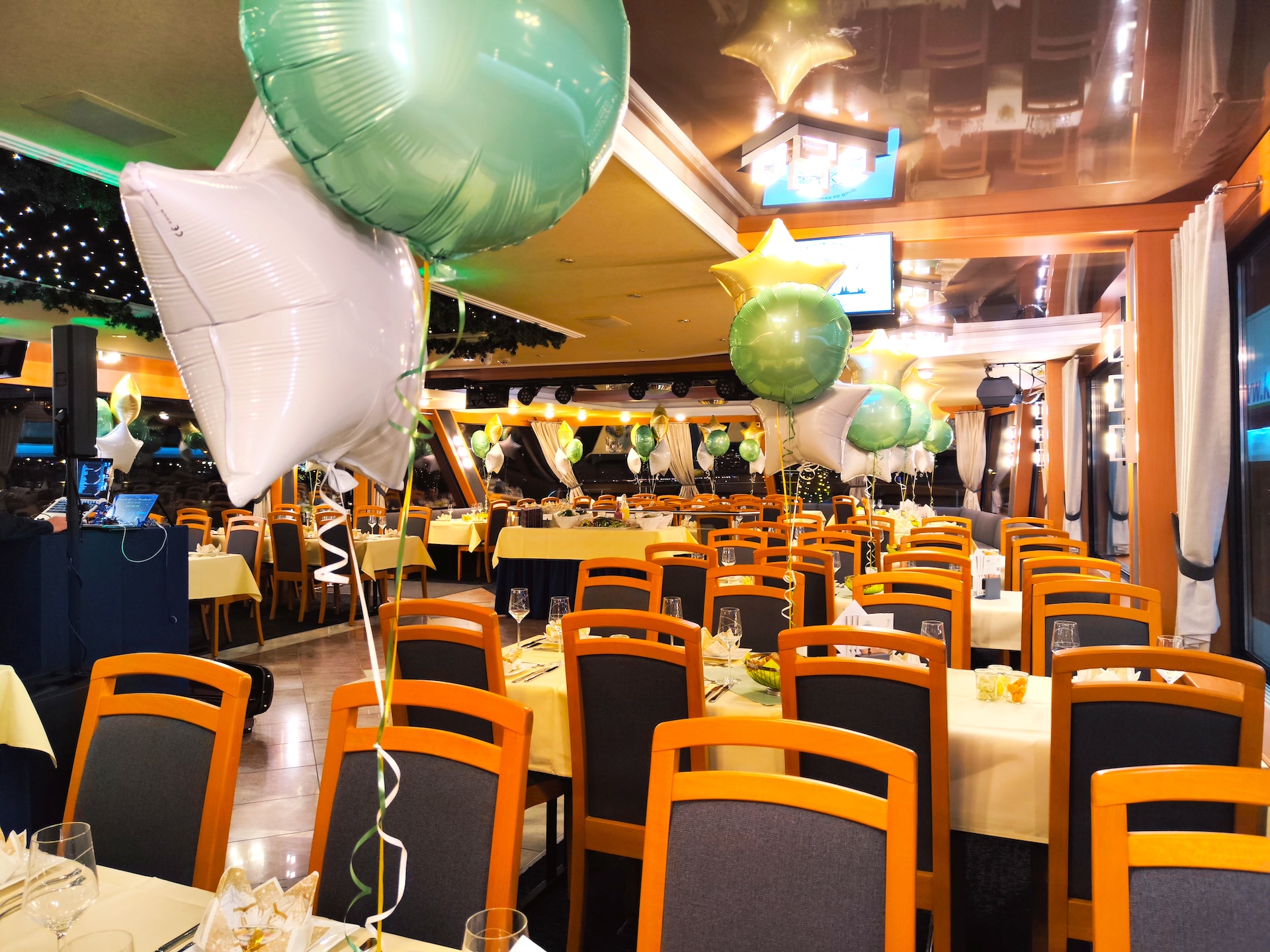 Während der mehrstündigen Fahrt auf dem Rhein genießen Sie ein liebevoll angerichtetes Buffet mit warmen und kalten Speisen, begleitet von einer Auswahl an Getränken und stimmungsvoller Musik. Ein DJ sorgt mit einem abwechslungsreichen Musikprogramm für gute Laune und Tanzfreude bis nach Mitternacht.